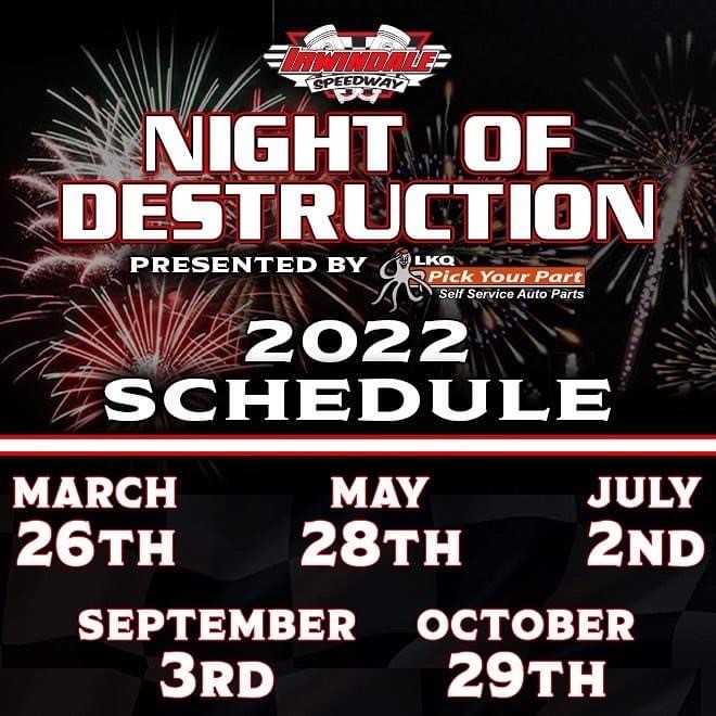 Night of Destruction presented by LKQ Pick-Your-Part will take over Irwindale Speedway for FIVE Dates in 2022!! The ARCA Menards West Series will come to town for the March 26th event and July 2nd “Independence Day Celebration”